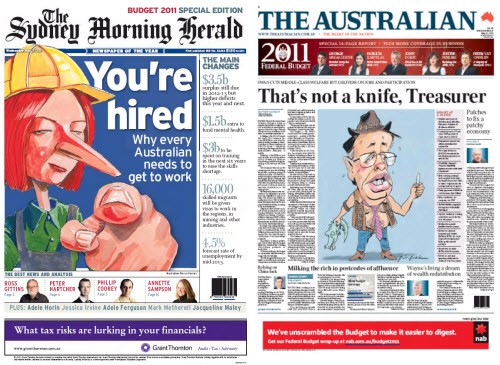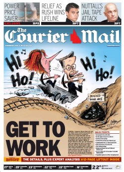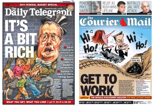 Post-budget front page wrap. It wouldn’t be a post-budget edition without a lovingly-drawn caricature of the prime minister and treasurer. This morning the tabloids have gone with top hats and mining carts: