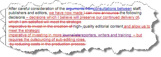 In an emailed missive to staff this morning obtained by Crikey — complete with a mess of track changes inserted by spin doctor Sue Cato — Hywood urged journos to “keep the big picture and longer term ambition for Fairfax Media in the frame”. The statement said 82 redundancies would be spread across the four major metro mastheads, a reduction of just eight full-timers on the original plan. All down-table subbing would be outsourced to controversial outfit Pagemasters by June 30.