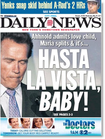 Front page of the day. After 40 or so movies and thousands of timeless catchphrases, the US tabloids were always going to have a field day with Arnold Schwarzenegger’s love child scandal: