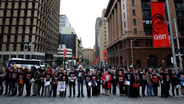 Forty-five Herald radicals, led by crack business scribe Stuart Washington, senior correspondents Adele Horin and Matthew Moore, deputy foreign editor Marcus Strom, investigations editor Anne Davies, popular TV critic Doug Anderson and reporters Erik Jensen and Jo Tovey descended on Martin Place in a coordinated “flash mob” event rivalling the best international examples of the activist tactic.