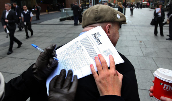 Sydney Morning Herald hacks have turned out in force at the city’s main business mall to remind loyal readers their broadsheet is under dire threat from Greg Hywood’s decision to sack the paper’s subeditors.