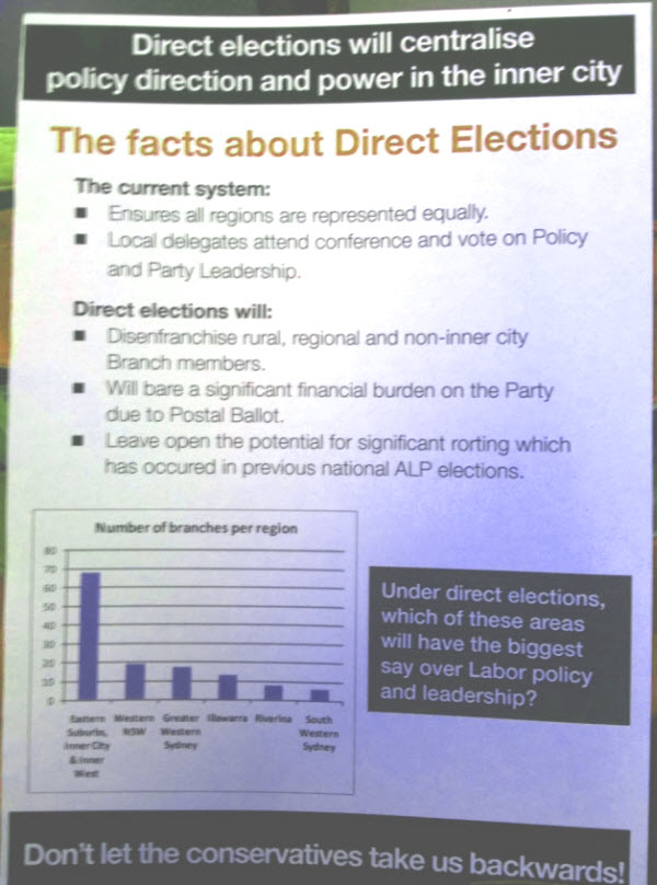 The document argues that direct election would skew representation towards inner-city branches, many of which are controlled by the Left. Currently the general secretary and admin committees are elected by state conference, which broadly reflects the factional makeup of the party — 60% controlled by the Right.