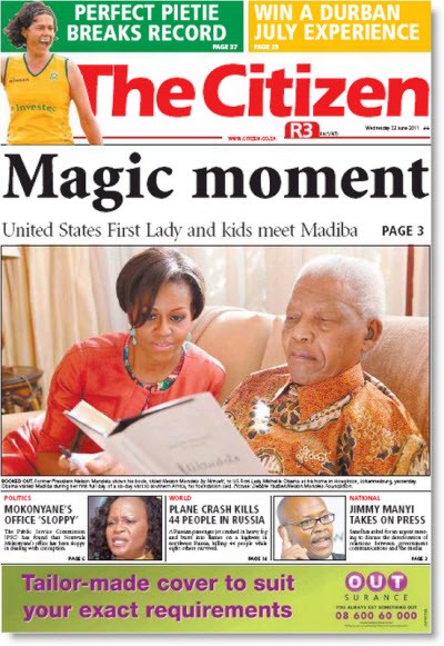 Front page of the day. South Africans have been captivated by a visit to their shores of US First Lady Michelle Obama. The Citizen was particularly spellbound by her visit to Nelson Mandela …