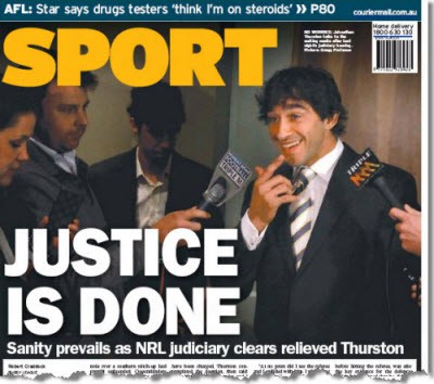 ‘Sanity prevails’ in paper Origin war. State of Origin fever spilled over into print this week as News Limited tabloids went to war on the judiciary appearance of star Queensland back Jonathan Thurston. As we reported yesterday, The Courier Mail went so far as to declare a “campaign to save JT” on yesterday’s front page, insisting Thurston had been stitched up by blue forces. Well JT got off last night, and the Snail was celebrating — “JUSTICE,” they declared, “IS DONE.” …