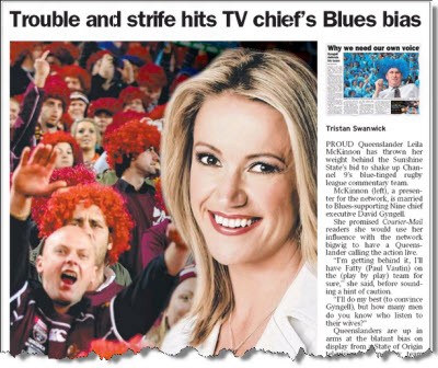 Origin bias fight in the bedroom. It’s a divisive game, state-of-origin footy. As Crikey reported, it’s already split two News Limited papers over Maroon halfback Johnathan Thurston’s right to play. Now bias in the commentary box has driven a rift in the marriage of PBL Media chief David Gyngell and wife/employee Leila McKinnon.