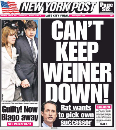 Front page of the day. The New York Post can’t — nay, won’t — let this story (and the opportunity for a headline) go: