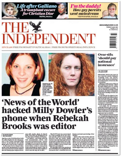 Front page of the day. The News of The World‘s phone hacking scandal has taken a sinister twist as revelations emerge that then-NotW editor Rebekkah Brooks had the phone of 13-year-old murder victim Milly Dowler hacked: