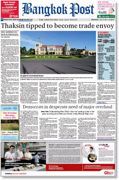 Front page of the day. While major newspapers the world over are obsessed with another newspaper — the scandal-plagued News of the World — in Thailand they’re still grappling with a major political shift …