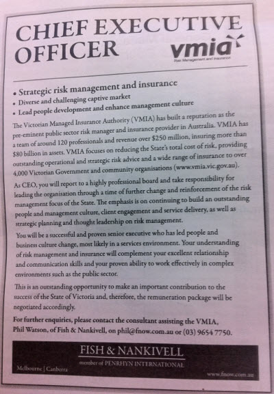 VMIA needs new CEO. Wanted: one of Victoria’s key government bodies is seeking a “successful and proven senior executive”, according to an advertisement in The Australian Financial Review today …