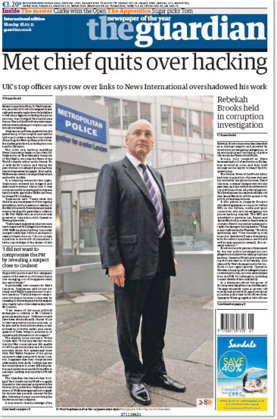 “In a carefully worded resignation speech that appeared aimed directly at Downing Street, Sir Paul Stephenson, the commissioner of the Metropolitan police, said the prime minister risked being “compromised” by his closeness to former News of the World editor Andy Coulson.” — The Guardian