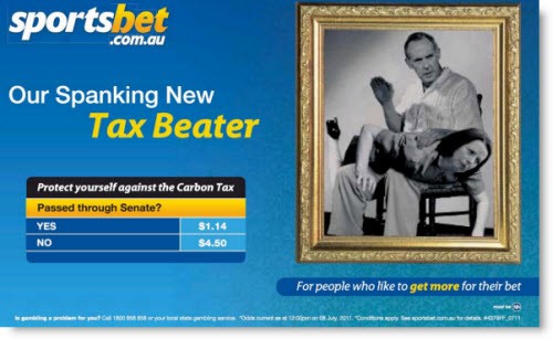 Not that the betting company is averse to controversial advertising stunts. Last week it ran this rather distasteful advertisement in the tabloids as part of its promotion of carbon tax betting markets …