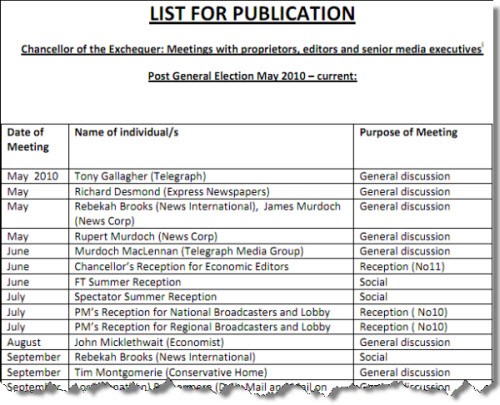 Chatting with the Chancellor. A glimpse at political life is provided by the list made available yesterday of the UK Chancellor of the Exchequer’s meetings with newspaper executives since the election of May 2010 …
