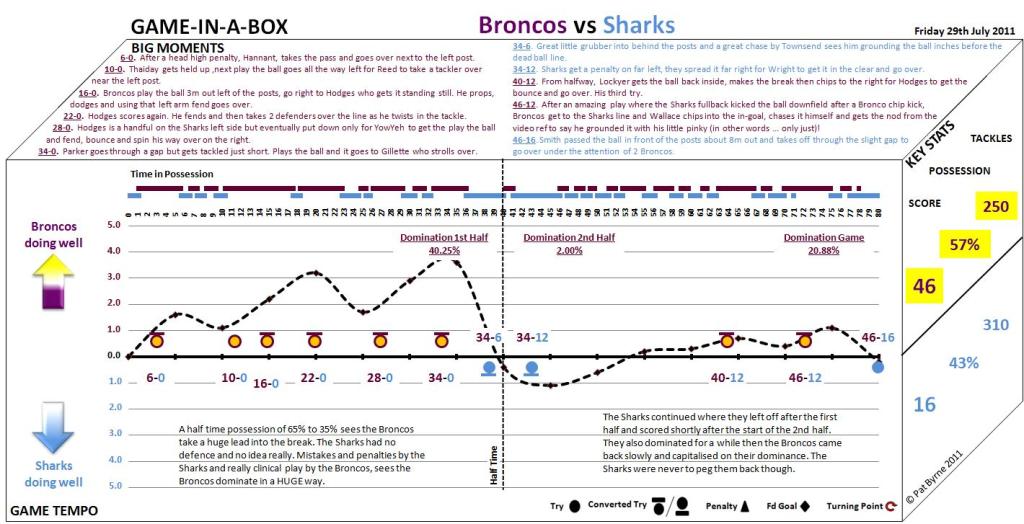 The Broncos dominated that first half by 40.25%!!  The largest figure I have ever recorded for a half and it showed in the score.  They were all over the Sharks.  You can see from the Game Tempo line, it was like a series of “waves”.  Three actually, each bigger than the last.  It was the Broncos riding those waves, sweeping the Sharks ahead of them.  Completely spanked their tales!  The Sharks were never going to win with that sort of domination against them and the possession for that first half was 65% to the Broncos and 35% to the Sharks.