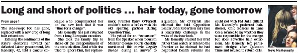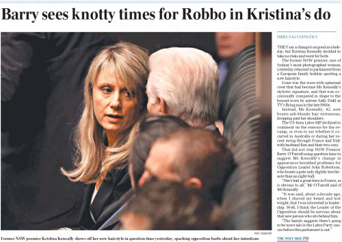 Keneally’s crop of long hair extensions “surprised the entire state”, The Daily Telegraph reported. Or as a shell-shocked Sydney Morning Herald said of the “mullet”: “Kristina Keneally walked into the chamber with her new hairstyle and nothing seemed to make sense any more.” Parliament was forced to suspend business to debate the startling makeover, as The Tele captured: