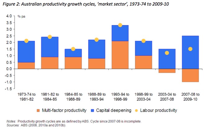 While the link continues to be made, it behoves me to bore readers by repeating the salient work of the Grattan Institute, which has looked at productivity of late and tried to assess labour productivity, most recently with this paper by Saul Eslake. Eslake’s not exactly a raging lefty on the issue — he suggests there may indeed be some scope for productivity benefits from some form of workplace deregulation.