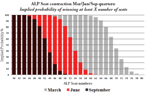 To use an example to explain it – in the March quarter, there was a 60% implied probability of the ALP winning at least 68 seats. By June, that 60% implied probability level had reduced to 52 seats. Now in September, it’s sitting on 42 seats – a full 26 seat contraction over the year from an already election- losing position.