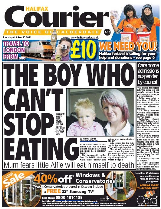Front page of the day.We wonder if there’s a more delicate way for the UK’s Halifax Courier to approach the subect of Prader-Willi syndrome: