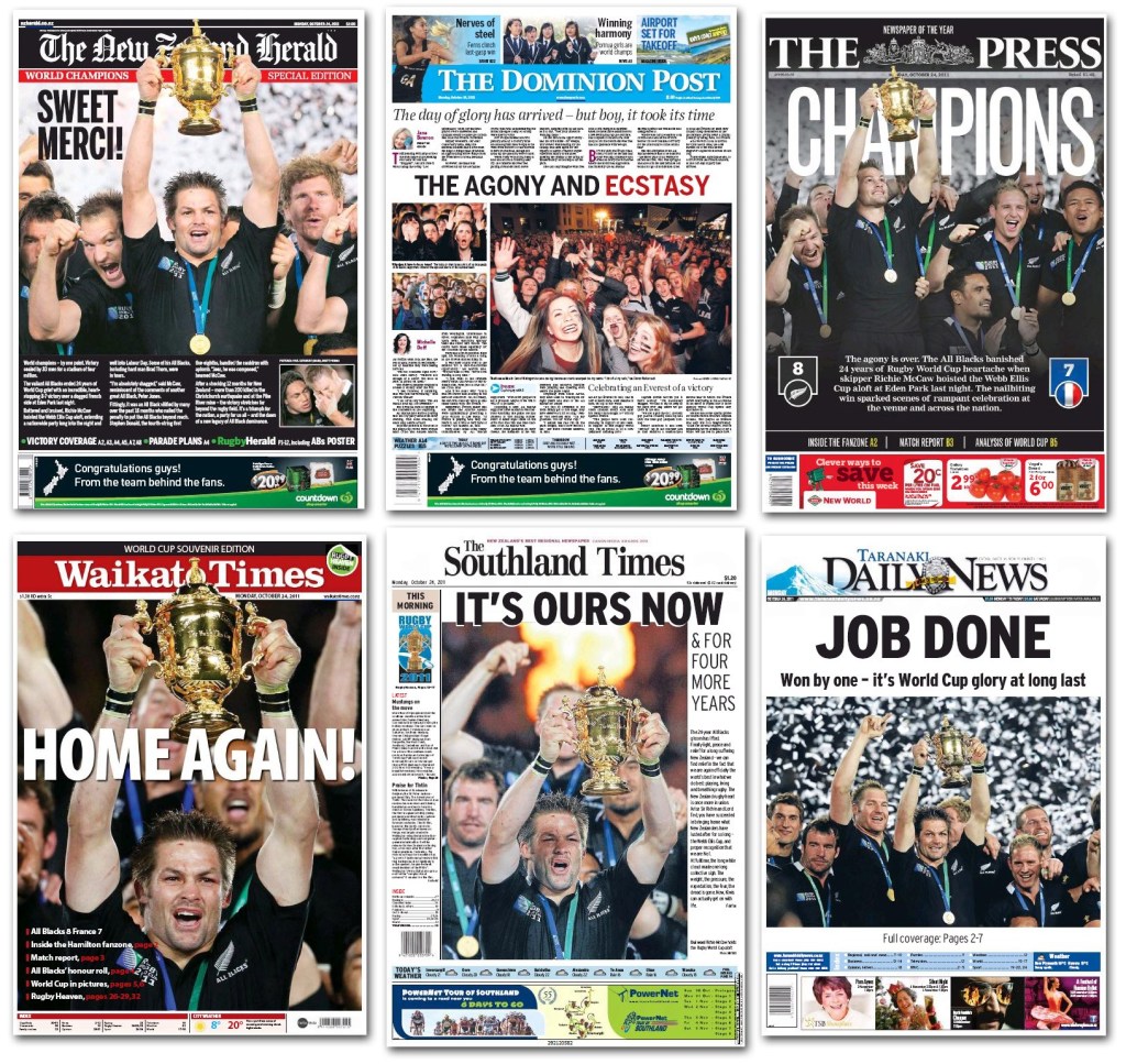 “No one could accuse New Zealand of not going over the top as Rugby World Cup hosts. The country fired its best shots, and then some. In winning the Webb Ellis Cup final though, the All Blacks were understated. Even a touch lucky.” — The New Zealand Herald