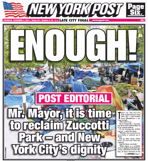 Front page of the day. Like Melbourne before it, New York appears to have had enough of its Occupy movement tent city …