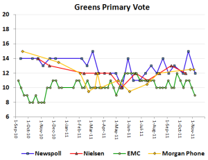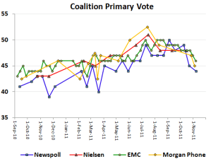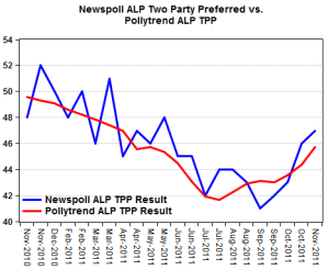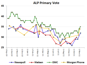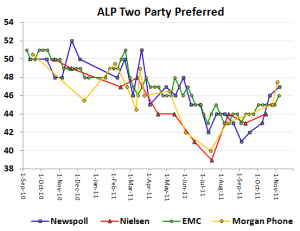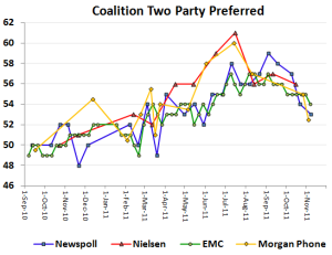 All our pollsters here have relative leans under 1%, so it’s hardly earthshaking stuff – and it certainly isn’t “bias” in any respectable sense of the word. Rather, Nielsen and Morgan tend to be more favourable to the Coalition by a small margin while EMC and Newspoll tend to be more favourable to Labor by a small margin – at least compared to what the aggregated results of all the pollsters together were saying at any given time.