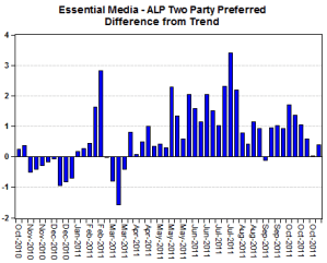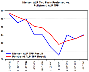 Taking the Essential Media chart– the producer of Essential Report – to use as an example, what we see is that after March this year, Essential Report consistently produced ALP Two Party Preferred results that were a point or two higher than our Pollytrend. At the other end, Nielsen up until July this year produced ALP two party preferred results that were consistently a few points lower for Labor than what our trend measures were showing at the time.