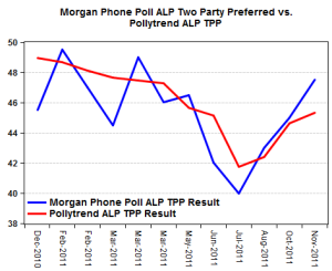 The other thing we need to be mindful of here is to only compare temporal like-with-like in the polling results. Not all pollsters produce the same amount of polls, so we have to take that into consideration. Essential Report comes out every week, Newspoll once a fortnight, Nielsen once a month and Morgan’s Phone Poll (we don’t use their face to face results here) gets produced whenever it gets produced.