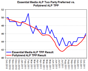 Taking the Essential Media chart– the producer of Essential Report – to use as an example, what we see is that after March this year, Essential Report consistently produced ALP Two Party Preferred results that were a point or two higher than our Pollytrend. At the other end, Nielsen up until July this year produced ALP two party preferred results that were consistently a few points lower for Labor than what our trend measures were showing at the time.