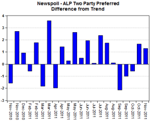 All our pollsters here have relative leans under 1%, so it’s hardly earthshaking stuff – and it certainly isn’t “bias” in any respectable sense of the word. Rather, Nielsen and Morgan tend to be more favourable to the Coalition by a small margin while EMC and Newspoll tend to be more favourable to Labor by a small margin – at least compared to what the aggregated results of all the pollsters together were saying at any given time.