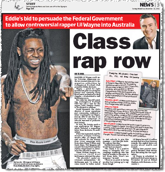 Why Eddie championed Lil’ Wayne. Nice to see Eddie “no conflict” McGuire popping up on page 3 of yesterday’s Sunday Herald Sun to assist US rapper Lil’ Wayne with a visa application for his imminent Australian tour. Eddie, it seemed, had written to promoter Paul Dainty to plead Wayne’s case with Immigration. And McGuire’s Collingwood Football Club had also bizarrely pitched in with a proposal to rope Lil’ Weezy — jailed last year on gun charges — into a local “Knives Scar Lives” education campaign. (What could he teach them other than not to bring guns to a knife fight?)