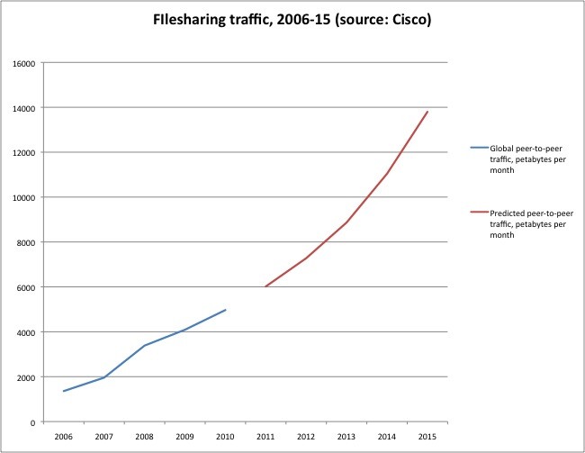 Despite previous attempt to prohibit filesharing, and the copyright industry’s attempt to outsource the pursuit of consumers to ISPs and ambulance-chasing lawyers, filesharing traffic is forecast to keep rising steadily. Cisco’s most recent figures suggest that while filesharing is no longer the biggest single source of internet traffic, it will accelerate in coming years.