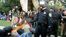 This student protest at the UC Davis campus was a protest in response to the hypocrisy I speak of and I can understand their resolute outrage. This protest was organised in response to a call for solidarity following the police violence on the UC Berkeley campus a week earlier. UC Berkeley Chancellor Robert J. Birgenau ordered police to break up a peaceful rally against increases in tuition fees. Unsurprisingly in the course of breaking up the protest police used batons against students resulting in injuries that included broken ribs.