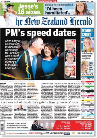 Front page of the day. There’s no rest for New Zealand Prime Minister John Key, re-election in national elections on Saturday …