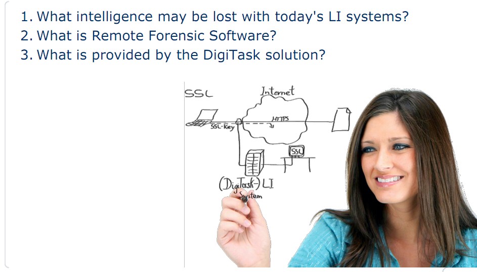 But compared to other firms, those techniques are absurdly subtle. The second approach to the problem of use of anonymous or encrypted communications platforms is to monitor a user’s activities end-to-end. German firm Digitask pitches the case that too much intelligence is being lost by people using internet-based applications and offers “stealth software” installed on a target’s computer to log and decrypt everything the target does. Earlier this year, the company admitted to selling the malware to the Bavarian government.