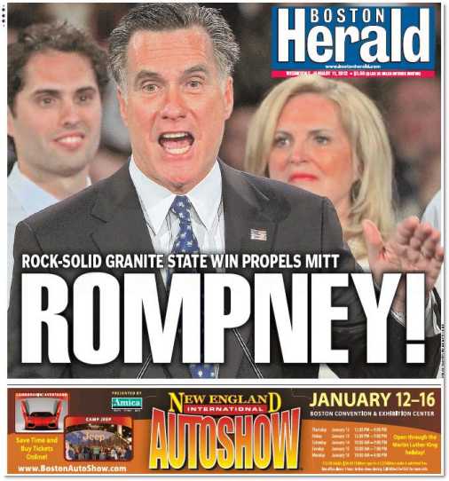 Front page of the day. The New Hampshire primary is over and it’s a “ROMPNEY” according to the Boston Herald: