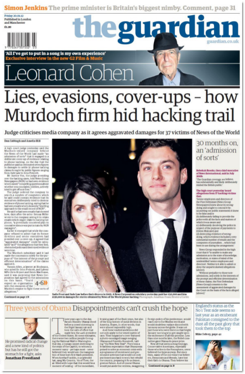 “A high court judge said the Murdoch-owned company behind the News of the World had made “an admission of sorts” that it engaged in a deliberate cover-up of evidence relating to phone hacking, on the day that the publisher paid an estimated seven figures in damages to settle 37 phone-hacking claims brought by public figures ranging from Jude Law to John Prescott.” — The Guardian