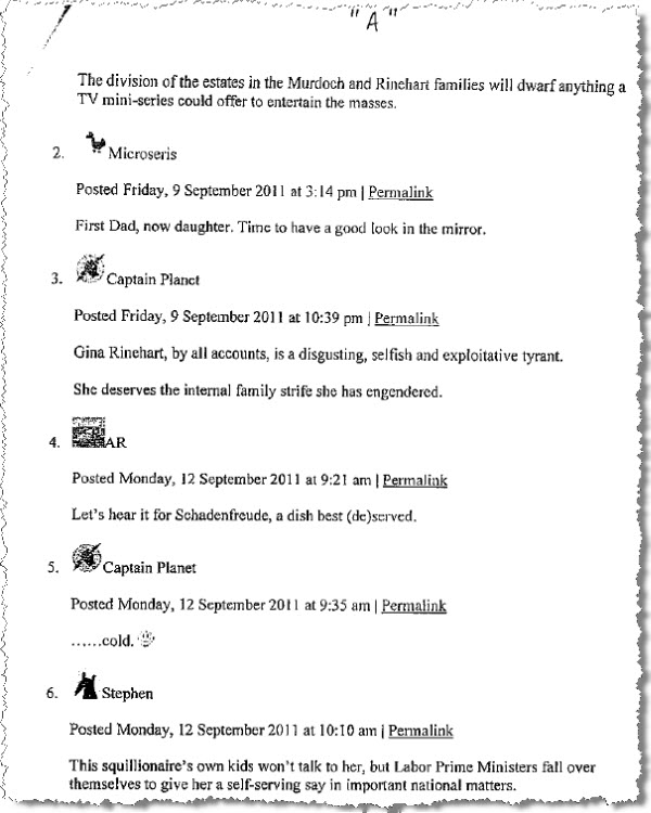 Bizarrely, the affidavit refers to exhibit “A” — a number of disparaging reader comments about Rinehart from the Crikey website. It also cites comment threads on Big Footy, some personal Tumblr blogs, and, um, Twitter …