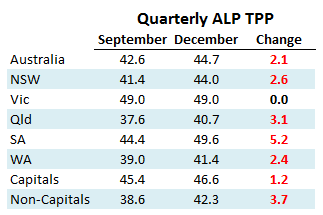 While the two party preferred only increased by 2.1% nationally for the ALP, they made 3.1% gains in Qld, 3.7% gains in regional Australia and 5.2% gains in South Australia. On the other hand, Victoria was flat and the capital cities only moved by 1.2% over the September quarter to December quarter period.