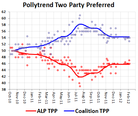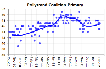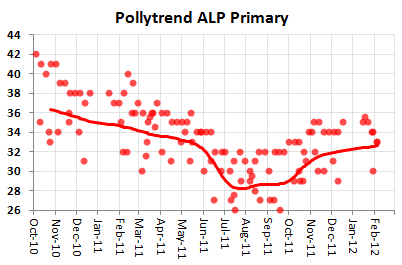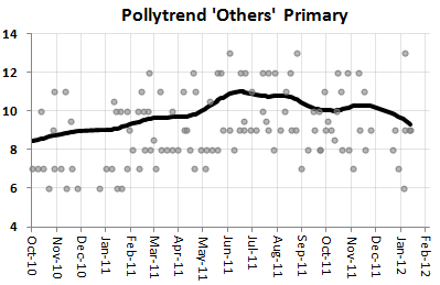 Meanwhile, the Greens continued their year long voyage of exploring political life between 11 and 12% public support and the broad “Others” – apart from pollsters having considerable variation in their vote estimates for this rag tag group – appeared to show a continuation of the slow fade that started after their June 2011 highs.
