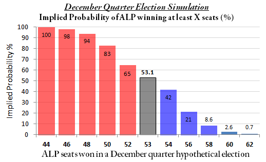 Moving on now to December quarter’s election simulation. For those not familiar with it, we grab three months worth of polling from the major pollsters and a few bits of unpublished stuff (usually giving us a pooled sample of around the 13 to 15 thousand mark), break it down by geography (by state first and foremost, but also by region when possible), turn the derived swings from those polling results into probability distributions for each seat (taking account of their sub-state geography) –then test those swings against the current seat margins about a million times with a monte carlo simulation and aggregate the results. We end up with a simulated election that shows us how many seats would have changed were an election held during that period and the results of the election closely resembled the polling.