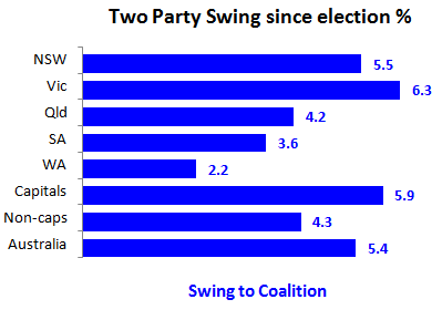 The government has a 5.4% swing away from them on the primary vote, washing out to a slightly smaller 4.3% swing away from them on the two party preferred. The Coalition has picked up 3.1 points on their primary while the Greens have lost 0.4 points. The broad “Others” have picked up 2.7 since the 2010 election.