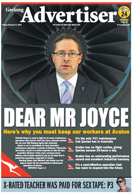 Front page of the day. Today’s Geelong Advertiser pleads with Qantas CEO Alan Joyce to spare the Flying Kangaroo’s Avalon — the airport near Geelong — airport.