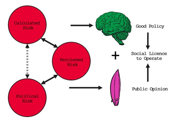 How these come together is shown in the following cartoon. It combines calculated and perceived risks in “good” policy making where the various economic, social and environmental interests in a complex risk are combined. The prize is a social licence to operate.