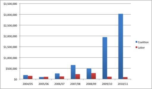 You can learn a lot from digging through 12 years worth of Australian Electoral Commission filings. Yesterday in Crikey, Bernard Keane published his findings after picking through mining company donations to state and federal Labor parties and the Coalition since 2004. The numbers revealed the extent to which the Coalition benefited from a surge in mining company generosity after the Rudd government released its RSPT proposal in May 2010. It’s particularly breathtaking in column graph form: