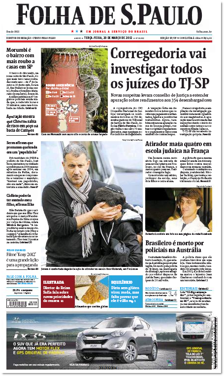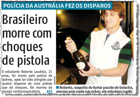 Front page of the day. This morning, Brazilians woke up to read about the death of 21-year-old student Roberto Laudisio at the hands of a police Taser. “Brazilian killed by police in Australia” reads a story on the front page of Brazilian newspaper Folha De S.Paulo today: