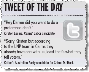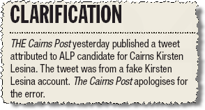 The Department of Corrections. The pitfalls of Twitter as a source #324: yesterday’s Cairns Post carried a clarification apologising to ALP candidate for Cairns Kirsten Lesina for printing a tweet that was in fact from a “fake” Kirsten Lesina. The fake tweet “of the day”: