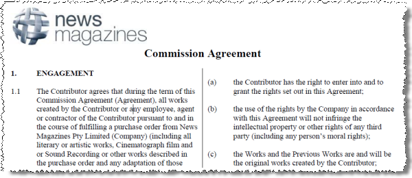 The PacMags contract (read it here) draws a distinction between “commissioned” work and that offered on a “supplier” basis. If it’s commissioned, then the author “assigns and licensees have the right to utilise the material … in any media currently known or hereafter created throughout the world in perpetuity, including (without limitation) any other magazine title and any website of the publisher and any related entity.” In the flash of a pen — for example, with a minor change to the word limit — a supplier piece, which attracts a default 12-month exclusive license, could easily transform into a commissioned one.
