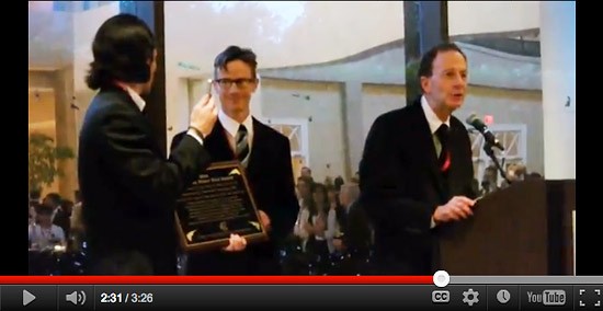 At a corporate event to garner support for secretive copyright treaty the Trans-Pacific Partnership, the Yes Men arrived and tried to present a fake award to US trade ambassador Ron Kirk.