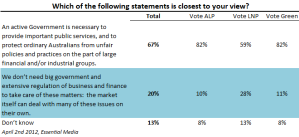 Or course not! We support giving assistance to other manufacturing sectors at a higher rate than we do for the motor vehicle industry. What is also interesting to note is that while 55% of Coalition voters believed government is too large, 66% of them believe in what can only be described as high levels of industry support – and do so at a rate higher than ALP voters.