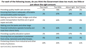 Think about that for a minute. The largest response, a plurality of the population, believes that government is too large, yet clear majorities want government to do more on health, education, public transport and bank regulation – while a plurality wants the government to do more on crime protection and pollution regulation.