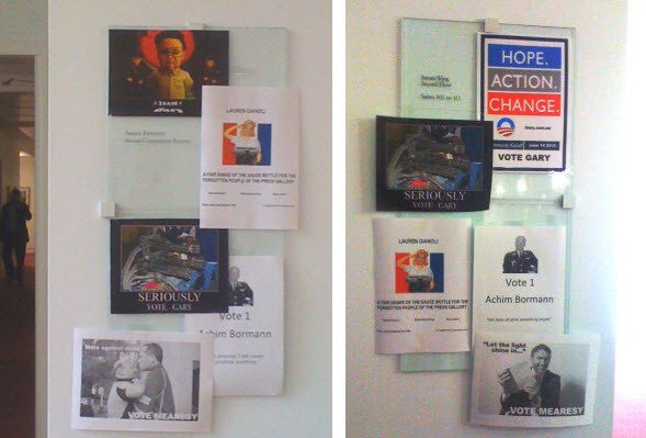 Now the student-politics style dirty tricks have already begun. This morning a rebel Taliban-style how-to-vote card led by Bormann emerged with Osborne and Gianoli listed as running mates alongside Riley. Ramage has also kicked his campaign into the stratosphere, posting an Obama-style “Hope” poster to buttress his bid for power, while Gianoli emphasised the female angle.